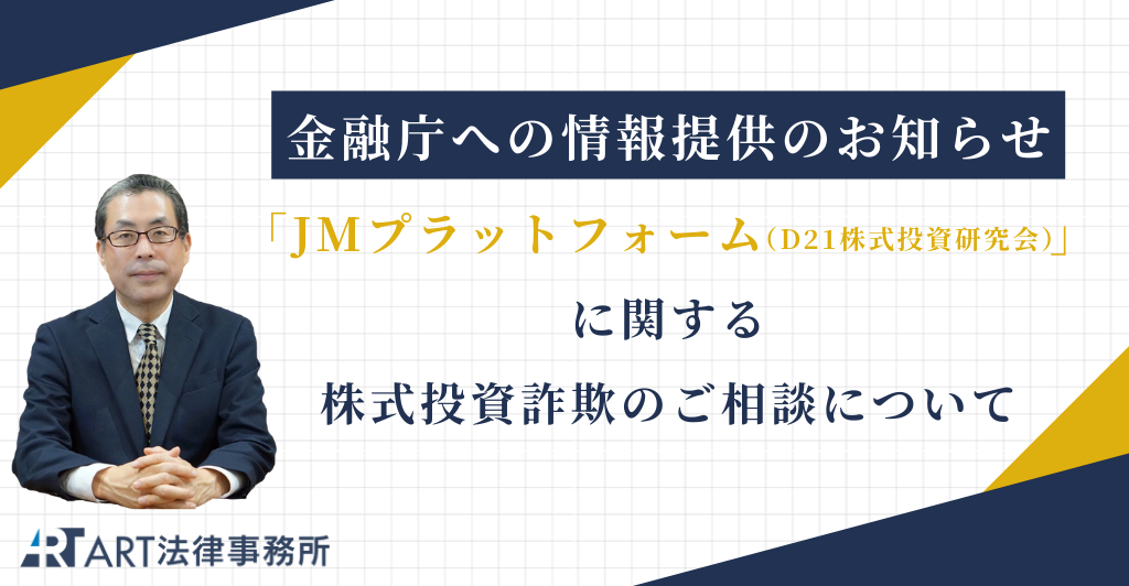 本記事は当事務所へ寄せられた、JMプラットフォーム(D21株式投資研究会)の相談内容をもとに、関係機関へ情報提供を行った事実をお知らせするものです。
